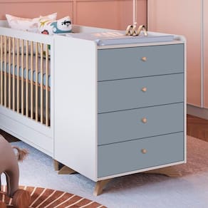 Essa cômoda 4 gavetas é versátil, prática e elegante, com características que a destacam. Ideal para o quarto do seu bebê ou criança, além de permitir que a use como trocador/fraldário! Gavetas que facilitam e otimizam o espaço e aconchego para o ambiente. Produto em MDP com corrediças telescópicas e puxadores em madeira, o que a torna um produto diferenciado! Bordas laterais em perfil plástico, garantido um acabamento premium.