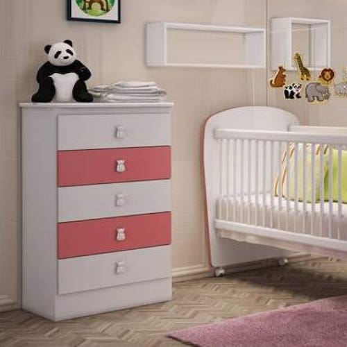 +A+c%F4moda+5+gavetas+%E9+fabricada+em+mdp+bp+branco+15+mm+%28nas+laterais+e+prateleiras%29%2C+acabamento+laca+nas+frentes+de+gaveta+%28branco%2C+branco%2Frosa%2C+branco%2Fazul+e+branco%2Flil%E1s%29.+Gavetas+com+corredi%E7a+telesc%F3pica.+Puxador+na+Cr+branca. Acabamento: Finish Foil Acabamento da Gaveta: Laca Altura: 92 cm Ambiente: Quarto de Bebê Complexidade da Montagem: Média: pode ser montado por mais de uma pessoa e/ou necessite de maior conhecimento para montagem Cr: Branco/Rosa Cr: Branco/Rosa Cr Interna: Branco Escala de Brilho: Brilhante Escala de Brilho da Gaveta: Brilhante Estilo: Moderno Gaveta com Chave: Não Itens Inclusos: 1 Cômoda e manual de montagem. Largura: 56 cm Material da Gaveta: MDP Material do Fundo: THDF Material Principal: MDP Necessita Montagem: Sim Peso: 27 kg Peso Máximo por Gaveta: 2 kg Possui Espelho: Não Possui Gavetas: 05 Possui Pés: Não Possui Portas: Não Possui Prateleiras: Não Profundidade: 38 cm Recomendações de Uso, Manutenção e Limpeza: É recomendado pano macio para limpezas do dia-a-dia e pano úmido para tirar a poeira. Sapatas Niveladoras: Não Sistema de Montagem: Parafusos, cavilha, prego. Tipo de Corrediça da Gaveta: Metálica Telescópica Tipo de Puxador da Gaveta: Externo