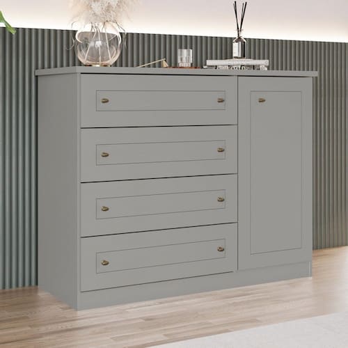 O(a) Cômoda de Bebê Americano 1 Porta 4 Gavetas Cinza - Henn é produzido em MDF e MDP na escala de brilho Brilho e Fosco, e possui um grau de dificuldade de montagem: Médio.
