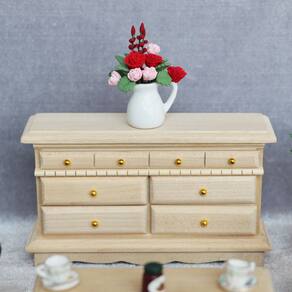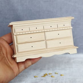 Tamanho: 13,2x3,7x7,6 cm Material: bétula Peso: 135 g Esta linda cômoda em miniatura possui 6 gavetas espaçosas com elegantes alças douradas, feitas de madeira de bétula durável. Perfeito para adicionar personagens a qualquer casa de bonecas ou cena em miniatura. A cômoda em escala 1:12 foi projetada para uso com casas de bonecas, tornando-a um ótimo complemento para qualquer ambiente de quarto ou sala de estar. Sua madeira inacabada permite a personalização com sua escolha de tinta ou acabamento. Adequado para crianças com mais de 3 anos, mas observe que este é um modelo em miniatura e não para uso real. Materiais seguros e não tóxicos garantem que seja adequado para crianças. Ideal para fingir brincar, esta mini cômoda incentiva a criatividade e a interpretação de papéis em casas de bonecas. A solução de armazenamento perfeita para seus acessórios em miniatura ou roupas de boneca. Esta peça é uma combinação perfeita para casas de bonecas em escala 1/12 e pode ser combinada com outras peças de móveis de madeira da sua coleção para uma configuração completa de uma mini casa dos sonhos.