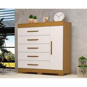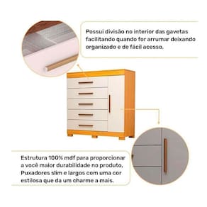 Material das Portas - Portas em MDF Tipo de Dobradiças - Dobradiças Metálicas Diferenciais das Portas - Portas com Detalhe Ripado Quantidade de Portas - 1 Porta de Abrir Material das Gavetas - Gavetas em MDF Tipo de Corrediça - c/ Corrediças Telescópicas Quantidade de Gavetas - 5 Diferenciais das Gavetas - c/ Divisórios Internas Tipo dos Pés - MDF Quantidade de Pés - 6 pés Material das Prateleiras - Prateleiras em MDF Quantidade de Prateleiras - 2