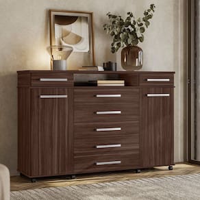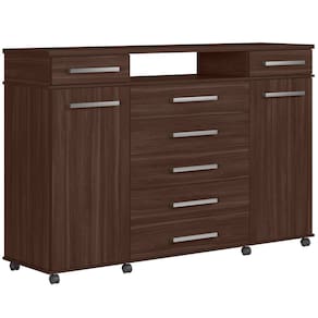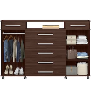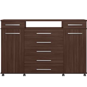 Cômoda robusta que oferece capacidade extrema de utilidade e organização devido ao grande número de gavetas e compartimento com portas sendo para sapatos e com bastão para cabides. Tampo reforçado de 25 mm para TVs de maior dimensão e rodízios para a movimentação facilitada do móvel no ambiente. Para garantir a qualidade do produto dentro da embalagem, as caixas são revestidas por um plástico termoencolhível e todas as peças são separadas por isomanta, tudo para preservar e evitar o atrito entre as peças dentro da embalagem. Você contará também com um manual com o passo a passo para auxiliar no momento da sua montagem.