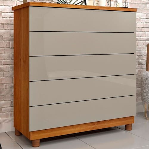 O(a) Cômoda Dona Premium 5 Gavetas Cinamomo/Off White - Pnr Móveis é produzido em MDF na escala de brilho Fosco, e possui um grau de dificuldade de montagem: Médio.