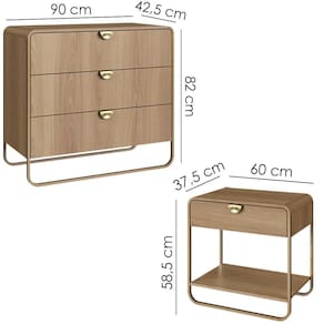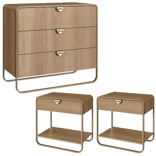 MDPConjunto de Cômoda e 2 Mesas de Cabeceira com design orgânico e contemporâneo, ideal para compor o quarto com praticidade. Estrutura em MDP 15 mm, cantoneiras em MDF e acabamento em pintura BP. Possui 5 gavetas com corrediças telescópicas, 2 prateleiras, puxadores em poliestireno (estilo meia-lua), pés em metal e sapatas plásticas que protegem o piso contra riscos. Produto entregue em 03 volumes.