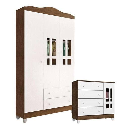 Cômoda e Guarda Roupa Infantil Ariel 3 Portas Branco Acetinado Amadeirado Carolina