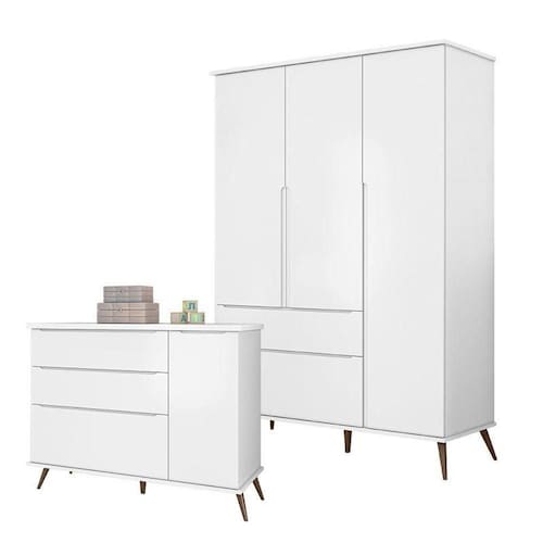 A cômoda e o Guarda Roupa infantil para quarto do bebê modelo retro com qualidade, lindo design e bom preço você encontra aqui, apresentamos mais uma linda opção Cômoda e Guarda Roupa Infantil Retro Alice Branco Acetinado com pés amadeirados, com amplo espaço você vai deixar todas as roupas e acessórios do seu bebê organizados com total conforto e comodidade confira!