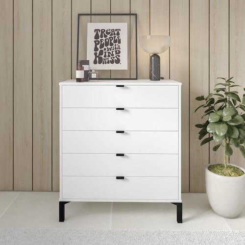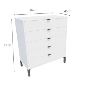 *Móvel produzido com madeira de reflorestamento. Acabamento da Gaveta: BP Acabamento dos Pés: Polipropileno Altura dos Pés: 12 Ambiente Principal: Quarto Complexidade da Montagem: Média: pode ser montado por mais de uma pessoa e/ou necessite de maior conhecimento para montagem Cor: Branco Cor do Produto: Branco Cor Interna: Branco Escala de Brilho: Fosco Escala de Brilho da Gaveta: Fosco Gaveta com Chave: Não Informações Complementares: Material (composição): Chapas em MDP de 15mm, revestido com laminado melamínico baixa pressão (BP) fosco. Possui traços retos e pés e puxadores em conceito industrial. Importante: o BP é um tipo de revestimento tratado com tecnologias específicas para dar Itens Inclusos: 1 Cômoda, 1 Kit Ferragens e 1 Manual de Montagem Linha ou Coleção: Timeless Manual de Montagem e Instalação: https://cdn2.madeiramadeira.com.br/atributo/falkk/1505292-fkex-901-comoda-5gv-queens-900.pdf Material da Gaveta: MDP Material do Fundo: Triplac Material do Puxador da Gaveta: Metal Material dos Pés: Polipropileno Material Principal: MDP Necessita Montagem: Sim Origem do Produto: Nacional Pés Reguláveis: Não Peso: 34.46 Peso Máximo por Gaveta: 6 Possui Espelho: Não Possui Nichos: Não Possui Pés: 04 Possui Portas: Não Possui Prateleiras: Não Possui Rodízio: Não Quantidade de Gavetas: 05 Gavetas Recomendações de Uso, Manutenção e Limpeza: Material (composição): Chapas em MDP de 15mm, revestido com laminado melamínico baixa pressão (BP) fosco. Possui traços retos e pés e puxadores em conceito industrial. Importante: o BP é um tipo de revestimento tratado com tecnologias específicas para dar maior resistência ao móvel. Esse é um dos diferenciais dos nossos produtos! Sapatas Niveladoras: Não Sistema de Montagem: Minifix, Parafuso e Cavilha. Suporta Até (kg): 45 Tipo de Corrediça da Gaveta: Metálica Simples Tipo de Puxador da Gaveta: Externo Ean: 7909903408827