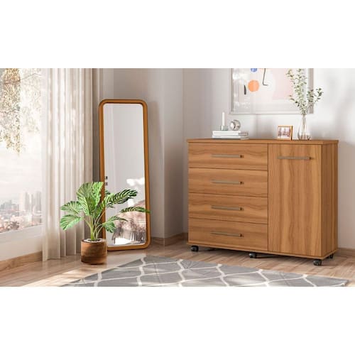 Cômoda 4 Gavetas 1 Porta Demóbile Flora A cômoda Flora da Demóbile é um móvel que leva beleza e funcionalidade à decoração e não pode faltar na hora de arquitetar um quarto ou closet. Esse imponente produto tem dimensões amplas, quatro gavetas com maior profundidade e deslize perfeito devido as corrediças telescópicas, facilitando bastante na hora de organizar roupas e acessórios pessoais. O móvel oferece ainda compartimento com uma porta porta, na parte interna a prateleira e o cabideiro para acomodação de roupas penduradas roubam a cena. Características técnicas: Desenvolvida em MDP Pintura e acabamento em na cor Amendola Possui 04 gavetas Possui 01 porta Inclui rodízios Corrediças telescópicas livres de enroscos Lindo design Maior espaço, organização e praticidade Peso suportado: Gaveta 3kg e Prateleira 4kg Dimensões: Altura: 101 cm Largura: 125 cm Profundidade: 45 cm Peso: 48 kg OBSERVAÇÕES IMPORTANTES A Combo Stock não se responsabiliza pela montagem ou desmontagem dos Produtos que deverão ser feitas por um . Estes serviços não estão inclusos nos valores dos mesmos. Pode haver alguma diferença de tonalidade entre a imagem e o produto real, por conta do tratamento de imagens e a calibração de cores do seu monitor. Ao receber a mercadoria, o cliente deverá verificar as dimensões e condições da embalagem, caso haja alguma não assine o de . Certifique-se de que estão adequados aos elevadores, portas e corredores do da , visto que NÃO fazemos a montagem, desmontagem do produto e/ou portas e janelas, pela escada ou içamentos pelo lado de fora do prédio. Em casos de Edifícios ou condomínios, o produto será entregue pela transportadora nas respectivas portarias (Porteiros) que deverão ser avisados da pelo comprador. Para quaisquer outras dúvidas conosco nos nossos canais de . As imagens e o ambiente são meramente ilustrativas. Não acompanha acessórios, eletrônicos ou demais móveis ambientados.