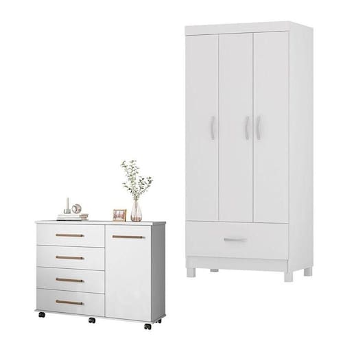 Cômoda Flora e Guarda Roupa Solteiro Prince Branco - Demóbile