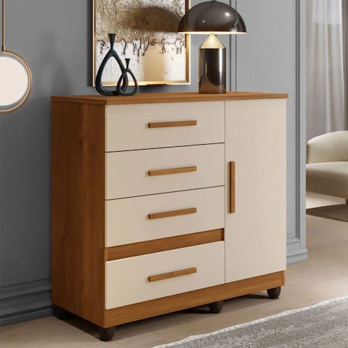 Caracteristicas: Tipo Pintura: Origem Do Produto: Ambiente Principal: Quarto Material Principal: MDP Possui Portas: 1 Possui Prateleira: 1 Possui Gavetas: 4 Possui Chave e Tranca: Nao Tipo Portas: Bater Tipo Puxador: Madeirado Complexidade Da Montagem: Medio Sistema De Montagem: Parafusos e Cavilha Possui Pes: 4 Rodizio Com Trava: Nao Altura Dos Pes: 5 Material Dos Pes: Pvc