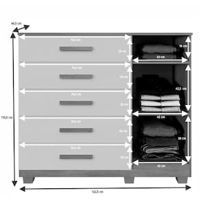 A Comoda Franca e uma opcao robusta e elegante, produzida em chapa de 15 mm que assegura durabilidade e resistencia excepcionais. Com uma porta, duas prateleiras e cinco gavetas equipadas com corredicas telescopicas, oferece organizacao pratica e eficiente, alem de um excelente custo-beneficio. O produto tambem vem com pes inclusos e puxadores na cor, agregando estilo ao seu ambiente.
