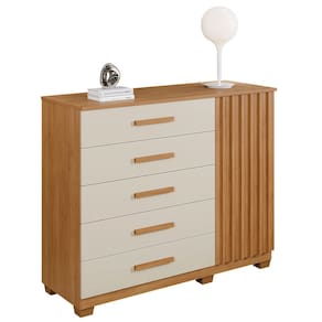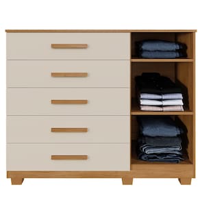 A Cômoda França é uma opção robusta e elegante, produzida em chapa de 15 mm que assegura durabilidade e resistência excepcionais. Com uma porta, duas prateleiras e cinco gavetas equipadas com corrediças telescópicas, oferece organização prática e eficiente, além de um excelente custo-benefício. O produto também vem com pés inclusos e puxadores na cor, agregando estilo ao seu ambiente.