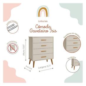 Para proporcionar modernidade no quartinho do bebê e também auxiliar na organização das roupinhas, sapatinhos e outros acessórios, apresentamos a Cômoda Gaveteiro Infantil Isis desenvolvida pela Reller com estrutura em MDF, amplo espaço interno e design super sofisticado, aproveite para realizar o sonho de ter móveis de alta qualidade!