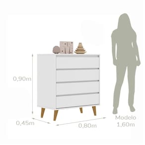 Seu formato compacto aliado às 4 gavetas espaçosas garante ótimo aproveitamento de espaço. O puxador tipo cava confere um visual moderno e seguro, enquanto os pés em madeira maciça proporcionam estabilidade e sofisticação ao móvel.