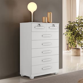 A Cômoda New Espanha é uma peça que une charme e elegância a qualquer ambiente. Com design sofisticado e estrutura robusta em chapa de 15 mm, oferece durabilidade e firmeza. Suas sete gavetas, duas delas com chave para segurança extra, e corrediças telescópicas garantem suavidade e praticidade no uso diário, mantendo roupas e acessórios organizados de forma impecável. Produzida com a tecnologia MDP Perfect, combina sustentabilidade com inovação, oferecendo alta durabilidade e fácil manutenção. A pintura UV, além de resistente, é ecologicamente responsável, feita com madeira de reflorestamento, promovendo um mobiliário sustentável e elegante.