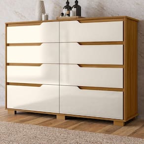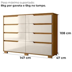 MDP | MDF-MDP | MDF-MDP | MDF-MDP | MDFA Cômoda Georgia alia funcionalidade e design moderno para organizar seu ambiente com estilo. Estrutura em MDP (gavetas e tampo 15 mm / base e fundo 12 mm) com acabamento em pintura UV. Conta com 8 gavetas (sendo 2 gavetões) equipadas com corrediças metálicas, puxadores em cava e pés em PVC. Possui sistema de montagem flexível, permitindo instalar as gavetas em duas posições diferentes conforme a necessidade. Este produto será entregue em 02 volumes.