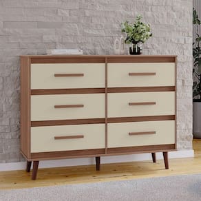 Com estilo contemporâneo e toque retrô, esta cômoda de 6 gavetas é ideal para organizar roupas, acessórios e itens do dia a dia com praticidade. Sua estrutura robusta conta com pés levemente inclinados, que proporcionam elegância e estabilidade ao móvel.