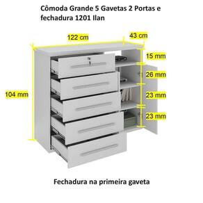 Cômoda Grande 5 Gavetas 2 Portas E Fechadura 1201 Ilan Carvalho * Imagens meramente ilustrativas. Cômoda enorme e multifuncional com 5 gavetas bem grandes com corrediças telescópicas, sapateira com 2 prateleiras, espaço para roteador/game ou para guardar objetos. - Fechadura na ira gaveta; - Sapateira; - Espaço para roteador/game ou organizador; - Tampo com 30mm de espessura - Puxadores resistentes; - 5 gavetas amplas e com corrediças telescópicas e reforçadas; DIMENSÕES DO PRODUTO MONTADO: ALTURA 104 CM LARGURA 122 CM PROFUNDIDADE 44 CM Manual de montagem vai dentro do produto, também disponível em nosso site, e temos vídeo no Youtube auxiliando na montagem. Atenção: Não nos responsabilizamos, no ato da , por desmontagens, subir escadas/elevadores ou transporte por guincho para apartamentos. Eventuais despesas são de responsabilidade do cliente. Confira as dimensões deste produto e certifique-se de que o mesmo passará normalmente por supostos elevadores, portas, escadas e/ou corredores de sua moradia.