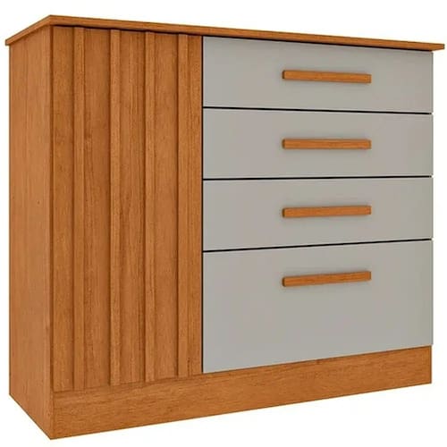 Cômoda Guarani Ripado 4 Gavetas 1 Porta Tcil A Cômoda Guarani Ripado 4 Gavetas 1 Porta Tcil é uma peça versátil e elegante, perfeita para organizar o seu quarto com estilo. Com um design moderno, ela se destaca pelos detalhes ripados na porta, que adicionam um toque de sofisticação e textura ao ambiente. A cômoda conta com quatro gavetas espaçosas com corrediças telescópicas, garantindo um deslizar suave e seguro. Além disso, a porta com prateleira interna oferece um espaço extra para guardar itens maiores, como cobertores, edredons ou caixas organizadoras. Fabricada com materiais de alta qualidade, a Cômoda Guarani é resistente e durável, feita para acompanhar o seu dia a dia. É a escolha ideal para quem busca funcionalidade e beleza em um único móvel, e você encontra essa qualidade e confiabilidade na Estrela Móveis.\nMedidas\nAltura 91 cm\nLargura 104 cm\nProfundidade 44 cm\nCaracterísticas\nModelo Cômoda Guarani\nTipo do produto Cômoda\nAmbiente Quarto\nMaterial MDP / MDF\nQuantidade de Prateleiras 01\nQuantidade de Portas 01 Ripada\nQuantidade de Gavetas 04\nTipo de Porta Bater\nAcabamento Pintura UV\nTipo de Corrediça Telescópica\nTipo de Dobradiça Metálica\nNecessita Montagem Sim\nAcompanha Manual de Instalação Sim\nInformações Importantes\nObjetos decorativos que porventura apareçam na foto, não acompanham o produto. Não nos responsabilizamos pela montagem/instalação dos produtos.\nMontagens, desmontagens e instalações são responsabilidades do cliente. Indicamos que contrate uma empresa de montagem ou um montador de sua confiança.\nAlém disso, favor verificar se os pés e acessórios estão dentro do forro inferior do produto. Em suma, todas as informações divulgadas sobre o produto são de responsabilidade do Fabricante.\nAs cores do produto podem variar de acordo com o seu monitor, a iluminação do ambiente em que você está e até mesmo a sua percepção visual. Além da cor, pequenos detalhes e acabamentos podem não ficar evidentes na foto, por isso as imagens são meramente ilustrativas.