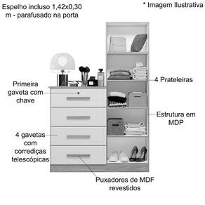 Característica da Cômoda Roupeiro: - Estrutura em MDP; - Acabamento de pintura em UV; - 1 porta de bater com dobradiças metálicas; - 4 Gavetas com corrediças telescópicas; - Primeira gaveta com chave; - Puxadores em MDF revestidos; - Espelho incluso 1,42x0,30 m - parafusado na porta; - 4 prateleiras internas; - Não acompanha itens de decoração ou quaisquer objetos fora o móvel na imagem; - Imagens interna meramente ilustrativa para ver a divisão do produto;