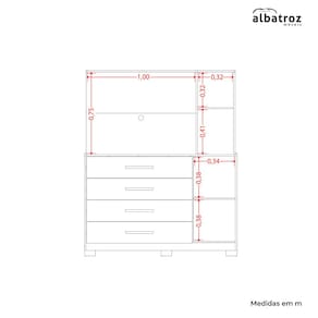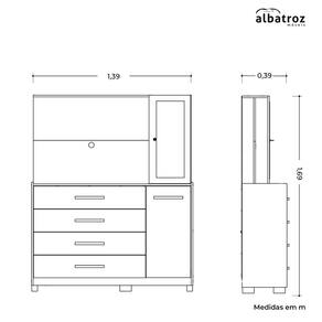 Características do Produto: Marca: Albatroz Modelo: Ilhabela Material do Produto: MDP Material da Porta: MDP Tipo de Pintura: Pintura UV Acabamento da Pintura: Fosco Material do Puxador: MDF Revestidos Tipo de Gaveta: Externa Tipo de Corrediça: Telescópicas Tipo de Porta: Bater Tipo de Dobradiça: Metálica Material dos Pés: ABS Possui Gavetas: Sim Q. de Gavetas: 4 Possui Portas: Sim Q. de Portas: 2 Possui Prateleiras: Sim Q. de Prateleiras: 3 Possui Pés: Sim Q. de Pés: 6 Possui Espelho: Sim Necessita Montagem: Sim Peso Suportado Pelas Gavetas -kg-: 5 Complexidade de Montagem: Alta Complexidade. Recomendasse a Contratação de Montador Profissional. Manutenção e Limpeza: Limpar Com Flanela ou Pano Macio Seco, Não Utilizar Produtos Abrasivos, Desengordurantes, Álcool ou Solvente. Não Expor o Produto Diretamente à Luz Solar e à Umidade.