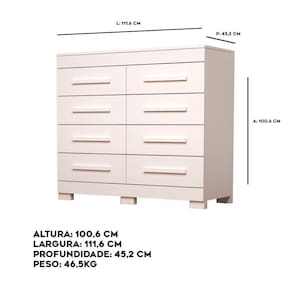 Transforme seu espaço com a Cômoda Índia: elegância e funcionalidade em um só móvel. Feita com 100% de MDF, oferece durabilidade e estilo incomparáveis. Suas 8 gavetas com corrediças telescópicas proporcionam praticidade e organização, enquanto os puxadores em MDF revestido agregam um toque de sofisticação. Renove sua casa com o melhor da qualidade e design!