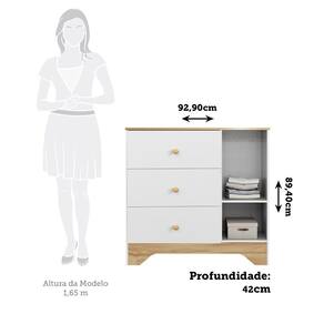 A cômoda é produzida com estrutura em MDF e acabamento em pintura UV atóxica. Possui 1 porta com janela em cristal PETG Cristal/Acrílico, que permite visualizar parte do interior do móvel, 3 gavetas que deslizam sob corrediças telescópicas, 1 prateleira que suporta até 5kg e puxadores em plástico. Acompanham o produto, 2 opções de rodapés, um usinado (torneado) e outro retrô, para que você escolha no momento da montagem qual se adequa ao estilo do ambiente. Aproveite para adquirir o seu agora! Acabamento da Gaveta: Pintura UV Acabamento da Porta: Pintura UV Acabamento da Prateleira: Pintura UV Ambiente Principal: Quarto Infantil Complexidade da Montagem: Alta: deve ser montado por um montador especializado Cor: Branco Brilho/Amêndoa Cor do Produto: Branco Brilho/Amêndoa Cor Interna: Linho Escala de Brilho: Brilhante Escala de Brilho da Gaveta: Brilhante Escala de Brilho da Porta: Brilhante Escala de Brilho da Prateleira: Semi-Brilho Gaveta com Chave: Não Informações Complementares: • Janela das portas em PETG cristal. • Fundo em HDF 3mm. • Acompanha 2 rodapés de montegem opcional, 1 reto e 1 torneado (usinado). • 1 cabideiro metálico. • Pintura atóxica. • Escala de Brilho: Branco Brilho e Amêndoa Semi-brilho Itens Inclusos: 1 Cômoda, Kit de Ferragens e Manual de Montagem Linha ou Coleção: Cocada Manual de Montagem e Instalação: https://product-hub-prd.madeiramadeira.com.br/929337/documents/d9ecc2d1-5b52-4316-b54b-450aa50b90984900790559cOmodaben1ptplus.pdf Material da Gaveta: MDF Material da Porta: MDF Material da Prateleira: MDF Material do Fundo: HDF 2,5mm Material do Puxador da Gaveta: Plástico Material do Puxador da Porta: Plástico Material Principal: MDF Montagem Flex: Sim, pode ser montado com rodapé retrô ou torneado/usinado. Necessita Montagem: Sim Origem do Produto: Nacional Peso: 33,2 kg Peso Máximo por Gaveta: 4 kg Peso Máximo por Prateleira: 5 kg Possui Espelho: Não Possui Nichos: Não Possui Pés: Não Possui Portas: Sim Possui Prateleiras: Sim Quantidade de Gavetas: 03 Gavetas Quantidade de Prateleiras: 01 Prateleira Recomendações de Uso, Manutenção e Limpeza: Para limpeza utilize somente pano limpo e macio, ligeiramente umidecido em água (apenas o bastante para remover a poeira), seguido de um pano seco. Sapatas Niveladoras: Sim Sistema de Montagem: Parafusos autoatarraxantes, conjuntos minifix, cavilhas de madeira, acessórios plásticos e metálicos Suporta Até (kg): 30 kg Tipo de Corrediça da Gaveta: Metálica Telescópica Tipo de Dobradiça/Corrediça da Porta: Metálica Tipo de Porta: Bater Tipo de Puxador da Gaveta: Externo Tipo de Puxador da Porta: Externo