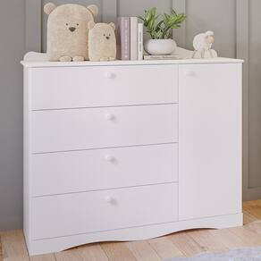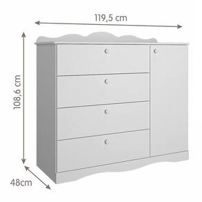 Cômoda Infantil 1 Porta E 4 Gavetas Branco - Permóbili Baby Branco Cômoda Infantil 1 Porta e 4 Gavetas - Permóbili Baby A Cômoda Infantil é ideal para quem precisa de bastante espaço para organizar as roupas dos pequenos. Feita com 100% MDF, um material ecologicamente correto, durável e resistente, a cômoda conta com 4 gavetas amplas equipadas com corrediças telescópicas, garantindo deslizamento suave, maior abertura e fácil acesso às roupas. Além disso, possui uma porta com prateleira interna e cabideiro, que você pode ajustar conforme suas necessidades. O tampo tem bordas arredondadas com pintura em laca atóxica, enquanto as peças retas recebem pintura UV também atóxica. Os puxadores são feitos de plástico ABS, oferecendo excelente acabamento e resistência. O toque final de charme fica por conta da moldura com curvas no estilo provençal, acrescentando um toque decorativo ao quarto das crianças. ESPECIFICAÇÕES: - Estrutura em MDF - Fundo em HDF 2,5mm - Pintura UV - 1 Porta - Dobradiças metálicas - 4 Gavetas - Corrediças telescópicas - Cabideiro de alumínio - Tampo com bordas arredondadas e acabamento em laca - 2 Opções de montagem: prateleira removível e cabideiro - Puxadores em ABS - Suporta até 3Kg em cada gaveta