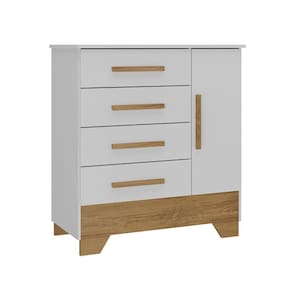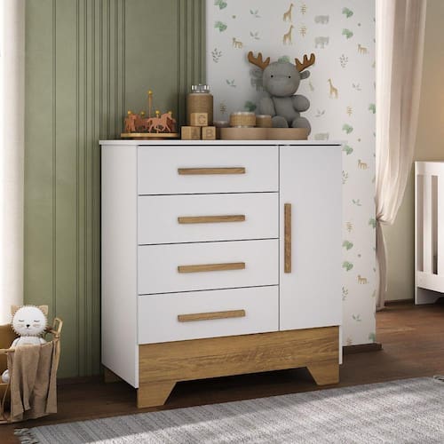 Cômoda Infantil 1 Porta e 4 Gavetas Tic Tac Branco Fosco/Nature. Apresentamos uma cômoda elegante e funcional, com atenção aos detalhes, incluindo pés usinados que adicionam um toque de estilo refinado ao design. Esses pés usinados conferem à cômoda uma estética única, combinando com o padrão moderno de cores internas e os outros elementos de acabamento. Construída com materiais de alta qualidade, como MDP de 12mm nas laterais, divisões, chapéus e prateleiras, MDP de 15mm nos rodapés, frente das gavetas, encabeçamento e portas, e um fundo de MDF de 3mm para garantir estabilidade e durabilidade. Além disso, a cômoda possui corrediças metálicas de 350mm para um funcionamento suave das gavetas, puxadores em MDF, e é finalizada com uma pintura UV fosca de padrão moderno. A montagem é simplificada com um manual detalhado que acompanha o produto. Ean: 7896614978841