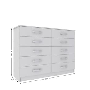 É fabricado 100% em MDP, conta com excelentes repartições e amplo espaço para você organizar roupas, calçados e objetos pessoais. Moderna e elegante tem 10 gavetas que proporcionam maior amplitude para organizar peças e objetos pessoais. Acabamento interno na mesma cor do móvel reúne harmoniosamente beleza, qualidade e durabilidade. Produto Montado: Sim Acabamento da Gaveta: Laca Ambiente Principal: Quarto Infantil codigo_ean: 7909903496428 Complexidade da Montagem: Baixa: pode ser montado por uma pessoa sozinha Cor: Branco Cor do Produto: Branco Cor Flex: Não Cor Interna: Branco Escala de Brilho: Fosco Gaveta com Chave: Não Itens Inclusos: 1 Cômoda, Kit Ferragens e Manual de Montagem Linha ou Coleção: Austin Manual de Montagem e Instalação: https://product-hub-prd.madeiramadeira.com.br/827578/documents/f7120c40-5b6e-49d5-ad5a-0c41f8f813d1465469manualcomoda0101.pdf Material da Gaveta: MDP Material do Fundo: MDP Material do Puxador da Gaveta: Cromado Material Principal: MDP modular: Não Montagem Flex: NAO Necessita Montagem: Sim Origem do Produto: Nacional Peso: 42 kg Peso Máximo por Gaveta: 20 kg Possui Espelho: Não Possui Nichos: Não Possui Pés: Não Possui Portas: Não Possui Prateleiras: Não Recomendações de Uso, Manutenção e Limpeza: Limpeza com pano umedecido. Sapatas Niveladoras: Não Sistema de Montagem: Cavilhas e Minifix Suporta Até (kg): 100 kg Tipo de Corrediça da Gaveta: Plástica Tipo de Puxador da Gaveta: Externo