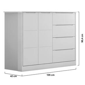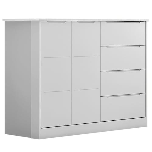 Características do Produto Material da Estrutura: 100% MDF 15mm. Peso suportado distribuído: 60 kg. Acabamento: Pintura UV. Escala de Brilho: Acetinado. Quantidade de Portas: 2 Portas. Tipo de Dobradiças: Metálicas. Tipo de Porta: Convencional. Quantidade de Gavetas: 4 Gavetas. Tipo de Corrediças: Telescópicas. Tipo de Puxador: Cava. Possui Prateleiras: Sim. Possui Pés: Não. Diferenciais: - Portas com dobradiças metálicas. - Gavetas com corrediças telescópicas. Sistema de Montagem: Minifix / Cavilhas / Parafusos. Manual de Montagem: Sim. Complexidade da Montagem: Média. Volumes: 2 Volumes. Conteúdo da embalagem: 1 Cômoda. Garantia do Fabricante: 90 dias contra defeito de fabricação. Montagem: Recomendamos que seja feita por um profissional. Recomendação de Limpeza: Pano levemente úmido e detergente neutro.