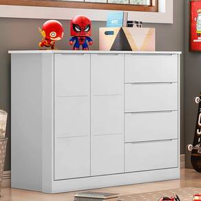 Além da beleza, essa Cômoda Para Quarto Infantil é super funcional, pois conta com 4 gavetas com corrediças telescópicas que deslizam suavemente, 2 portas e 2 prateleiras internas para você guardar as roupinhas, toalhas, lenços e fraldas. Perfeita para compor o quarto de bebê!
