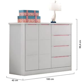 Esta cômoda conta com 2 portas, prateleira, cabideiro e 4 gavetas com corrediças telescópicas que desliza suavemente. É fabricada 100% em MDF com chapa de 12/15mm, revestimento em Pintura Uv atóxica, garantindo segurança e resistência ao móvel.