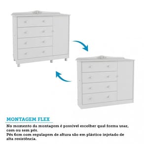 Caracter?sticas: 1 Cabideiro met?lico 1 Portas 1 Prateleira 4 Gavetas 6 P?s em Pl?stico com regulagem Acabamento pintura UV at?xica Corredi?as met?licas telesc?picas Dobradi?a met?lica Estrutura 100 em MDF Produto Flex pode ser montado com ou sem p?s Puxadores pontuais em pl?stico Suporta at? 40kg ao total, sendo 5 por prateleira e 4 por gaveta