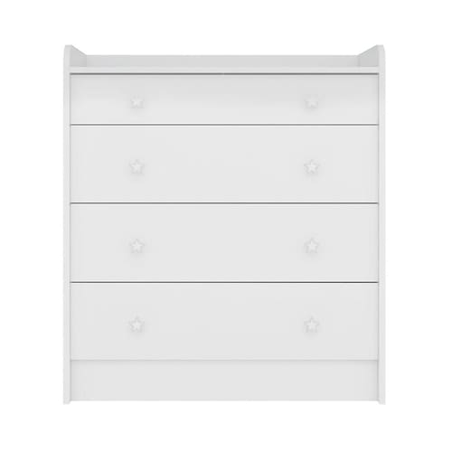 ESPECIFICAÇÕES: Estrutura em MDP Pintura UV atóxica 4 Gavetas Corrediças metálicas Puxadores em forma de estrela Trocador embutido Sistema antitombamento Maior organização e praticidade Não acompanha colchonete