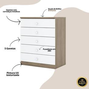 Com 5 gavetas espaçosas e corrediças metálicas, ela oferece amplo espaço para guardar roupinhas, fraldas e acessórios.