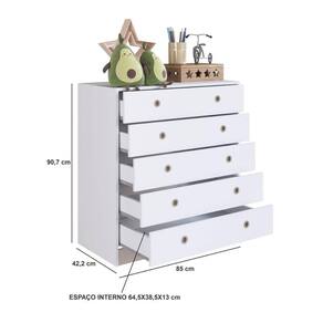 A cômoda CD050 possui estrutura em MDP 15mm e acabamento FF fosco possui 5 gavetas com puxadores embutidos em plástico, corrediças metálicas e que suportam 5kgs cada. Costas 3mm. Produto suporta até 25kgs. Necessita fixação na parede e parafusos estão inclusos. Conteúdo da embalagem: móvel, ferragens e manual de montagem. A fixação das peças e/ou acessórios é feita por parafusos, cavilhas e minifix. Para uma limpeza mais efetiva, utilizar apenas pano macio umedecido e sabão neutro. Não utilizar produtos abrasivos. Garantia de 03 meses contra defeitos de fabricação. Medidas do produto (AxLxP): 90,7x85x42,2cm. Peso do produto: 33,70kgs.