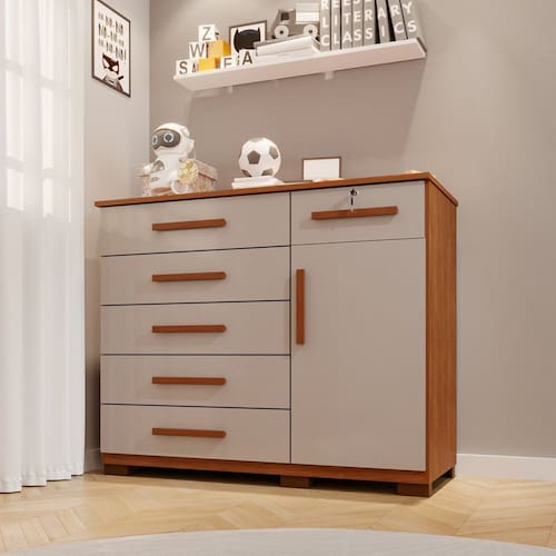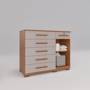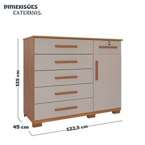 Prática e segura, esta cômoda infantil conta com 6 gavetas espaçosas, sendo uma com chave para guardar itens com mais privacidade. Equipada com corrediças telescópicas e puxadores amadeirados, une durabilidade e estilo. O kit de pés incluso completa o visual, elevando o móvel e facilitando a limpeza do ambiente. Produto Montado: Sim Acabamento da Gaveta: Pintura UV Acabamento da Porta: Pintura UV Acabamento da Prateleira: Pintura UV Altura dos Pés: 5 cm Altura Máxima dos Pés: 5.0000 Ambiente Principal: Quarto Infantil codigo_ean: 7900288214928 Complexidade da Montagem: Média: pode ser montado por mais de uma pessoa e/ou necessite de maior conhecimento para montagem Cor: Cinamomo / Off White Cor do Produto: Cinamomo / Off White Escala de Brilho: Semi-Fosco Escala de Brilho da Porta: Semi-Fosco Escala de Brilho da Prateleira: Semi-Fosco Gaveta com Chave: Sim Itens Inclusos: 1 Cômoda, Manual de Montagem e Kit Ferragens. Linha ou Coleção: Sofia Manual de Montagem e Instalação: https://product-hub-prd.madeiramadeira.com.br/918033931/documents/a3604301-f1cb-4e96-8dae-886a9d050af93101630493817537897728547.pdf Marca: Espresso Móveis Material da Gaveta: MDP Material da Porta: MDP Material da Prateleira: MDP Material do Fundo: MDF Material dos Pés: Plástico Material Principal: MDP modular: Não Necessita Montagem: Sim Origem do Produto: Nacional Peso: 57,3 kg Peso Máximo por Gaveta: 5 kg Peso Máximo por Prateleira: 5 kg Possui Espelho: Não Possui Nichos: Não Possui Pés: 06 Possui Portas: Sim Possui Prateleiras: Sim Possui Rodízio: Não Quantidade de Gavetas: 06 Gavetas Recomendações de Uso, Manutenção e Limpeza: Limpeza com pano macio e levemente umedecido. Não utilizar solventes a base e de inflamáveis. Não utilizar produtos abrasivos. Sapatas Niveladoras: Não Sistema de Montagem: Parafusos e cavilhas Suporta Até (kg): 40 kg Tipo de Corrediça da Gaveta: Metálica Telescópica Tipo de Dobradiça/Corrediça da Porta: Metálica Tipo de Porta: Bater Tipo de Puxador da Gaveta: Externo Tipo de Puxador da Porta: Externo