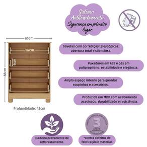 Cômoda Infantil 65cm Com 4 Gavetas Allegra Multimóveis Mp4421 Madeirado/branco Madeirado/branco Criada para acompanhar a doçura da infância, a Cômoda Infantil 65cm com 4 Gavetas Allegra Multimóveis MP4421 traz o equilíbrio perfeito entre estilo e utilidade. Suas gavetas espaçosas ajudam a manter o quarto sempre em ordem, enquanto o visual delicado transforma o ambiente em um espaço ainda mais acolhedor. Um móvel que cuida, decora e facilita. Diferenciais: - 3 anos de garantia contra defeitos de fabricação e material. - Produzida em madeira de reflorestamento (MDP 12/15mm) com acabamento acetinado (cerca de 20% de brilho): sustentabilidade e durabilidade. - 4 gavetas: amplo espaço interno para organizar roupinhas e acessórios. - Corrediças telescópicas: permitem a abertura total e o manuseio silencioso das gavetas. - Puxadores em ABS redondos e práticos. - Pés em polipropileno e rodapé: estabilidade e elegância. - Sistema antitombamento: proporciona segurança para o bebê e tranquilidade aos pais.