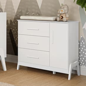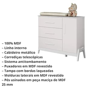 A Cômoda Infantil Guti Retro Peroba Cor Branco, referencia 5371.1, com puxadores em ABS, cabideiro metálico, tampo com bordas laqueadas, molduras laterais em MDF revestido, pés usinados em peça maciça de MDF 25 mm, linho interno e sistema antitombamento. Um design retro encantador com a praticidade que você precisa para organizar os itens do seu pequeno. Com acabamentos em branco , a cômoda é perfeita para trazer um toque de elegância ao ambiente. Ela se destaca-se pelo seu estilo único que se adapta a diferentes decorações. O acabamento em peroba e as cores harmoniosas proporcionam um visual atraente, enquanto suas linhas retas garantem que o móvel seja atemporal e sempre em alta. Além do seu design encantador, a Cômoda Guti Retro é uma escolha inteligente para quem busca qualidade e funcionalidade. Com espaço suficiente para armazenar roupas, brinquedos e outros itens essenciais, ela se torna um aliado na rotina do dia a dia. O material MDF garante que o móvel seja resistente e fácil de manter, enquanto o estilo retro proporciona um charme especial ao quarto infantil.