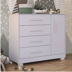 A Cômoda Infantil Charlô Peroba Cor Branco referência 3793.1, com puxadores em ABS, cabideiro metálico, tampo com bordas laqueadas, molduras laterais em MDF revestido, pés reguláveis em ABS inclusos, corrediças telescópicas e sistema antitombamento. A combinação perfeita de estilo, praticidade e segurança, ideal para armazenar roupas, brinquedos e outros itens essenciais. O acabamento em branco traz leveza e luminosidade ao ambiente, enquanto suas linhas retas e suaves garantem um toque contemporâneo. Com 4 gavetas e 1 porta, este móvel oferece amplo espaço para organizar itens do dia a dia, tornando a rotina mais prática. Fabricada em 100% MDF, a cômoda é uma escolha segura para o quarto das crianças. O material é livre de substâncias tóxicas, garantindo um ambiente saudável. Além disso, a resistência do MDF proporciona durabilidade, fazendo com que a cômoda acompanhe o crescimento do seu filho por muitos anos. As gavetas são ideais para armazenar roupas, enquanto o compartimento com porta pode ser utilizado para guardar brinquedos ou outros itens maiores.