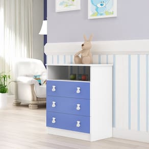 A Cômoda Infantil é a solução prática e elegante para manter o quarto sempre organizado. Com um design funcional, ela oferece amplo espaço interno por meio de gavetas espaçosas, perfeitas para guardar roupinhas, fraldas e outros itens essenciais do dia a dia. Produzida em MDP de qualidade, conta com gavetas que garantem abertura suave e puxadores decorativos plásticos que complementam o visual do móvel. Compacta e versátil, a cômoda se adapta facilmente a diferentes estilos de decoração, unindo praticidade e charme em um só produto. CARACTERÍSTICAS TÉCNICAS: - Estrutura em MDP de 15 mm - Acabamento Brilho na cor Branco e Azul - Gavetas com Roldanas - Puxadores Decorativos em Plástico - Dispõe de 1 Nicho - Suporta até 5 kg por Gaveta INFORMAÇÕES TÉCNICAS: Altura: 83 cm Largura: 63 cm Profundidade: 43,5 cm Peso: 25 kg INFORMAÇÕES ADICIONAIS: -ATENÇÃO: Não trabalhamos e não nos responsabilizamos pela montagem do móvel. Antes da montagem conferir se o produto está de acordo com o que comprou, produto montado e danificado pela montagem não será aceito troca. -As imagens ambientadas são meramente ilustrativas e podem apresentar itens que não compõe o produto. As cores do produto podem variar de acordo com o monitor, a iluminação do ambiente ou sua percepção visual. -Limpeza: Deve ser feita com pano macio e seco ou levemente umedecido com água e sabão neutro. Não devem ser utilizados abrasivos como palha de aço e objetos cortantes. Garantia para defeitos de fabricação conforme Código de Defesa do Consumidor.