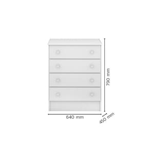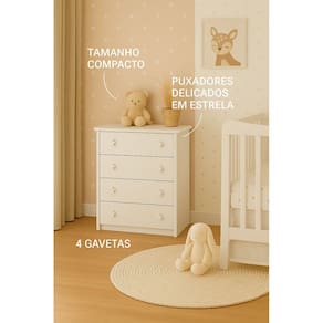 O destaque fica por conta dos puxadores duplos em formato de estrela, que dão um toque delicado e encantador à decoração. Para mais tranquilidade, a cômoda conta com sistema anti-tombamento, reforçando a segurança no ambiente infantil.
