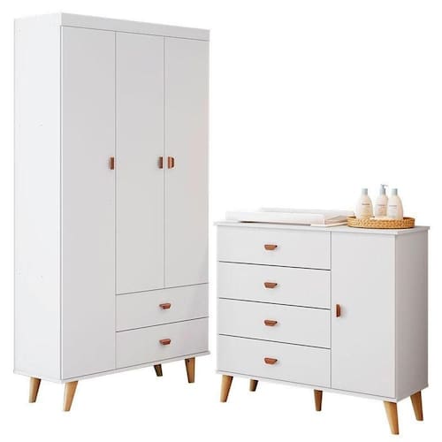 Cômoda Infantil com Guarda Roupa 3 Portas Duda Branco Acetinado Bétula - Carolina