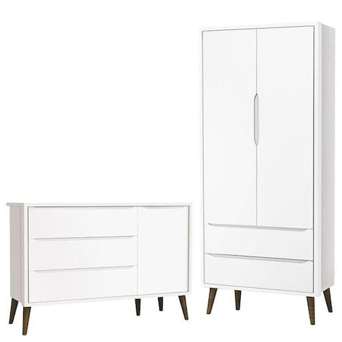 Cômoda Infantil com Porta e Guarda Roupa 2 Portas Theo Branco Acetinado com Pés Amadeirado Reller