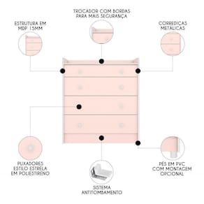 Acompanha pés opcionais em PVC para garantir estabilidade, evitando o contato direto com o chão, enquanto os puxadores duplos de plástico poliestireno, com formato de estrela proporcionam um toque fantástico ao o móvel. O acabamento de alta qualidade, revestido em pintura UV, realça a cor, trazendo um toque sofisticado. Além disso, a cômoda possui sistema antitombamento, oferecendo ainda mais segurança. Essa Cômoda Trocador É perfeita para quem procura aliar estilo na decoração, tornando a rotina com o bebê mais confortável em todas as necessidades do dia a dia.