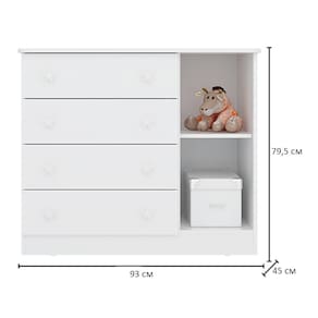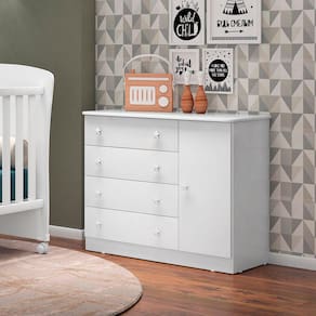 Características:Estrutura em MDPAcabamento em Pintura UV Atóxica04 Gavetas01 Porta articuladaGavetas com corrediças telescópicas de 350mmPuxadores em formato de estrelaSistema anti-tombamento para evitar riscos de acidentes demais móveis.Objetos decorativos não acompanham o produto.Limpar utilizando apenas pano umedecido com água, nunca utilizar abrasivos ou esponjas de aço. Acompanha manual e todos os acessórios para montagem. Recomendamos que a montagem seja feita por um profissional. Garantia de 03 meses para eventuais defeitos de fabricação.Dimensões:Altura: 79,5 cmLargura: 93 cmProfundidade: 45 cmItens Inclusos:01 CômodaInformações de Transporte:Peso Total: 50 Kg1 VolumeATENÇÃO OBSERVAÇÕES IMPORTANTES.As imagens são meramente ilustrativas, não serão enviados objetos de decoração, eletrônicos e demais itens que não estejam especificados nos itens inclusos. É indispensável que seja feita a conferência do produto no ato da entrega e caso haja alguma divergência, seja feito o contato imediato com a loja e notificação no canhoto. Constatando defeito no ato da entrega o produto não deverá ser montado até tratativa com a loja. Não será efetuada a troca do produto após a montagem ter sido efetuada. A montagem é de total responsabilidade do cliente e defeitos na montagem serão tratadas como assistências. Os processos de pendências serão tratados mediante a fotos para analise e conferência da informação. As cores do produto podem variar de acordo com o seu monitor, a iluminação do ambiente em que você está e até mesmo a sua percepção visual. Não nos responsabilizamos, no ato da entrega, por subir escadas e elevadores. Eventuais despesas são de responsabilidade do cliente. Dúvidas serão tratadas via protocolo.