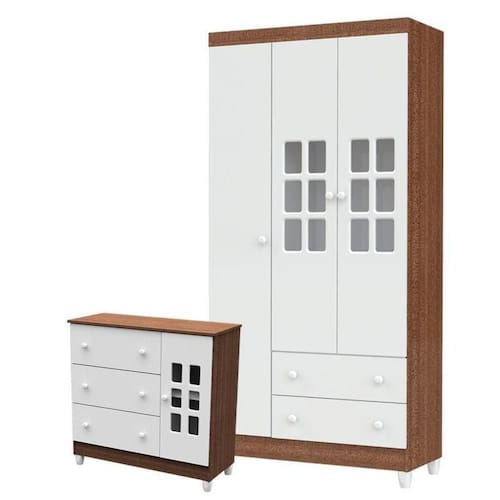 Cômoda Infantil e Guarda Roupa 3 Portas Mariah Branco Acetinado Amadeirado - Carolina