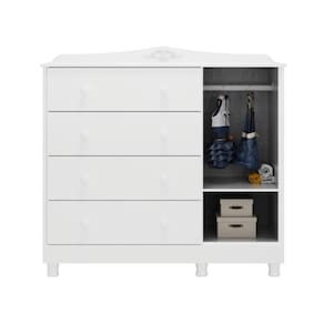 A Cômoda Infantil Elô Peroba Cor Branco referência P2556, com puxadores em ABS, cabideiro metálico, tampo com bordas laqueadas, molduras laterais em MDF revestido, pés reguláveis em ABS inclusos, corrediças telescópicas, linho interno e sistema antitombamento. Acombinação perfeita de estilo, praticidade e segurança, ideal para armazenar roupas, brinquedos e outros itens essenciais.O acabamento em branco traz leveza e luminosidade ao ambiente, enquanto suas linhas retas e suaves garantem um toque contemporâneo. Com 4 gavetas e 1 porta, este móvel oferece amplo espaço para organizar itens do dia a dia, tornando a rotina mais prática.Fabricada em100% MDF, a cômoda é uma escolha segura para o quarto das crianças. O material é livre de substâncias tóxicas, garantindo um ambiente saudável. Além disso, a resistência do MDF proporciona durabilidade, fazendo com que a cômoda acompanhe o crescimento do seu filho por muitos anos.As gavetas são ideais para armazenar roupas, enquanto o compartimento com porta pode ser utilizado para guardar brinquedos ou outros itens maiores.