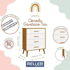 Cômoda Infantil Isis 4 Gavetas Branco/savana - Reller Móveis Branco/savana Cômoda Infantil Isis 4 Gavetas - Reller Móveis A Cômoda Infantil Isis 4 Gavetas, possui design moderno um amplo espaço nas gavetas para guardar as roupinhas do bebê dobradas. Produzida 100% MDF, garantindo mais durabilidade e resistência ao produto, as gavetas possuem puxadores em madeira ideal para mais conforto, praticidade e beleza. ESPECIFICAÇÕES: - Estrutura 100% MDF - Pintura UV atóxica - Acabamento fosco - 4 Gavetas - Corrediças telescópicas - Sistema anti-tombamento - Puxadores em madeira - Pés estilo retrô em madeira - Amplo espaço interno